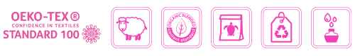 We use certified organic cotton & water based inks on all of our screen prints. 100% recycled synthetics: Polyester, Nylon and Elastane. Responsibly sourced Merino wool.